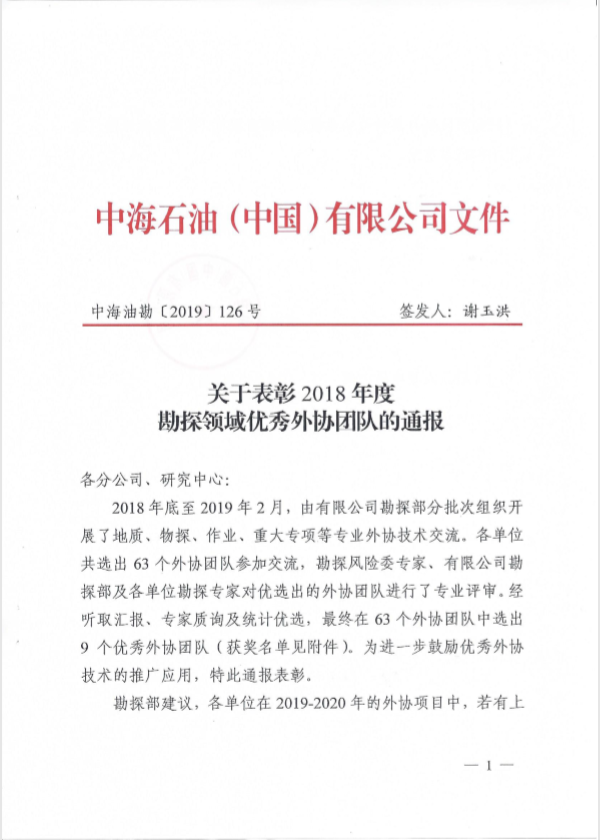 任建业教授研究团队获评勘探领域2018年优秀外协团队。