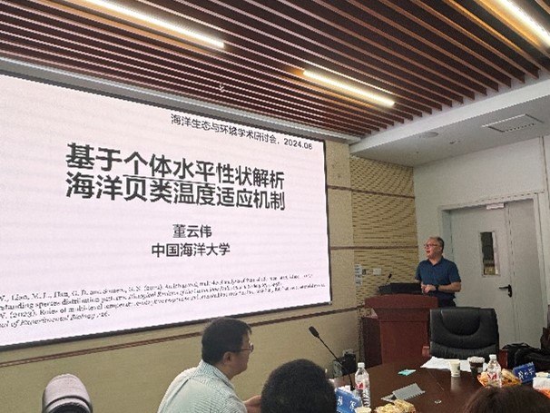 中国海洋大学董云伟教授应邀作《基于个体水平性状解析海洋贝类温度适应机制》报告。董教授的研究团队基于多年野外调查,发现了沿岸建筑不仅会改变本地群落结构,还会促使南方种北移,重构潮间带生物地理格局。基于区域海洋动力学模型和生理生态模型,发现沿岸建筑和冬季极端低温事件减少是潮间带生物分布区北移的关键驱动因子,未来升温会促进其分布区继续北移。接着,董云伟团队通过连续记录中国潮间带生物的遗传进化模式,发现南北生物的遗传进化模式存在显著差异。除此之外,董教授还提到生物对环境的适应同时体现在大尺度和小尺度。最后董教授表示当前气候变化和人类活动正改变着生物的分布格局,随之带来了复杂的生态、表型和遗传性状变化。由此,多时空尺度的表型和遗传变化将对生物分布的评估和预测带来巨大挑战,长时间序列原位观测和机理分析是准确评估和预测环境变化生态效应的必要手段。