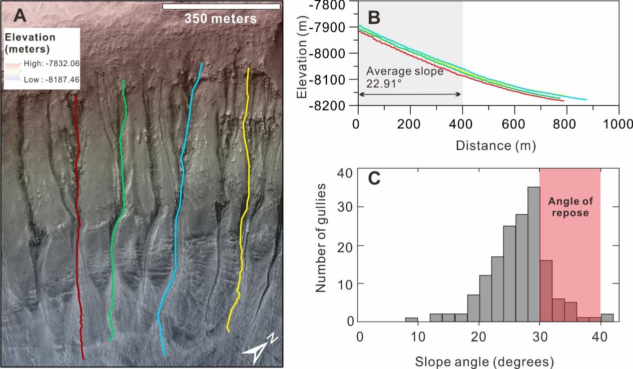 图1. 火星表面低坡度冲沟地貌。(A)火星勘测轨道飞行器高分辨率成像科学实验(HiRISE)图像PSP_004176_1405;(B)图A中部分冲沟的高程剖面;(C) 火星冲沟坡度频率分布直方图。
