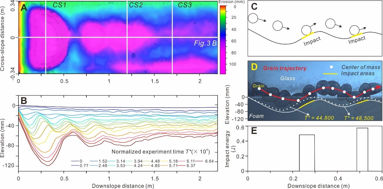 图2. 水槽实验结果。(A)总侵蚀量分布;(B)中心线剖面的地形演化;(C)凹槽形成过程的简要图解;(D)侧视摄像机记录的颗粒撞击凹槽瞬间;(E)颗粒撞击处的冲击能量。