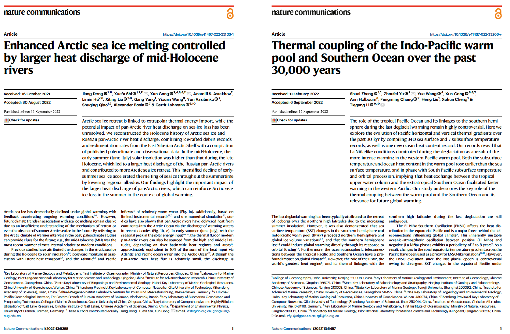 Dong, J., Shi, X., Gong, X., Astakhov, A.S., Hu, L., Liu, X., Yang, G., Wang, Y., Vasilenko, Y., Qiao, S. and Bosin, A., Enhanced Arctic sea ice melting controlled by larger heat discharge of mid-Holocene rivers. Nature Communications 13, 5368 (2022). (宫勋教授作为共同第一作兼共同通讯作者)