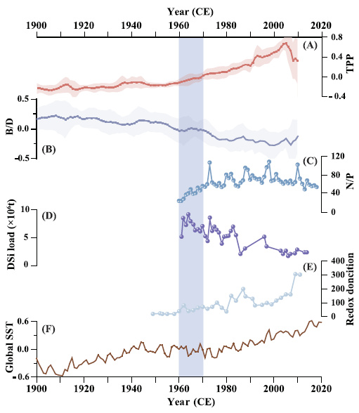本研究通过对东海海域近百年生物标志物反演的初级生产力数据进行整理和分析,通过多种统计方法对百年来硅、甲藻的变化特征和主要调控因素进行了分析,结果指示着东海区域的生产力格局存在空间异质性。研究结果体现了陆-海统筹对海洋初级生产力格局的影响,气候模态变化调控着长江流域径流量变化,携带着更多人类影响下营养物质,影响着海洋硅/甲藻群落的变化。