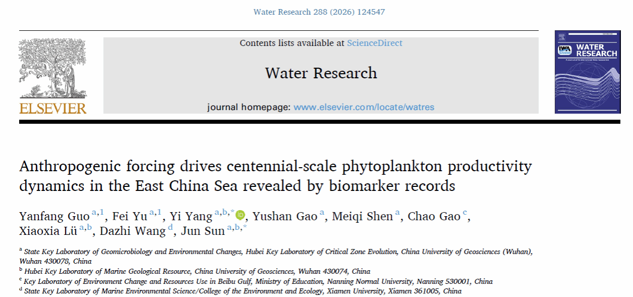 近日,环境科学Nature Index期刊《Water Research》刊发杨义副教授研究生郭艳芳(已毕业)和博士生余飞作为共同第一作者的学术论文—Anthropogenic forcing drives centennial-scale phytoplankton productivity dynamics in the East China Sea revealed by biomarker records(生物标志物记录揭示了人类活动强迫驱动东海百年尺度浮游植物生产力动态变化)。该成果是免费色播网站-成人黄色直播网站 杨义副教授联合孙军教授团队和厦门大学王大志教授团队共同完成。通讯作者为杨义副教授和孙军教授。
